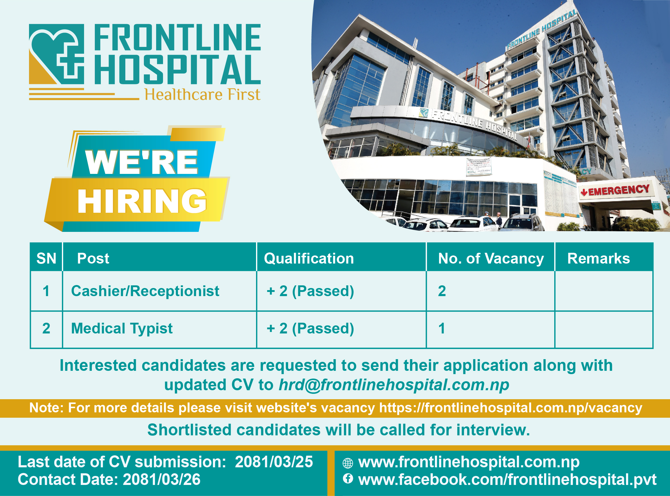 Interested candidates are requested to send their application along with updated CV to hrd@frontlinehospital.com.np